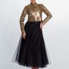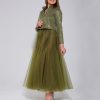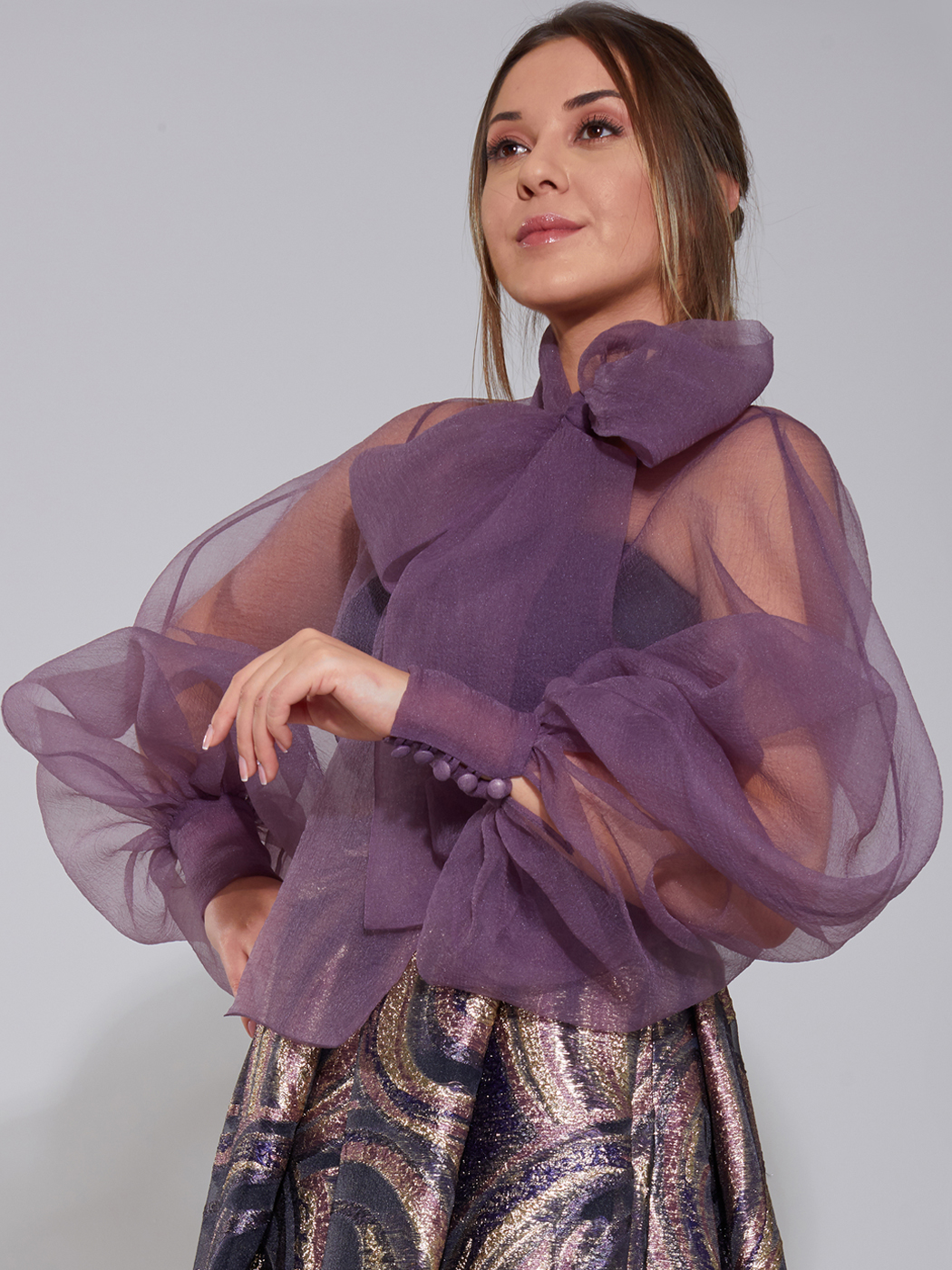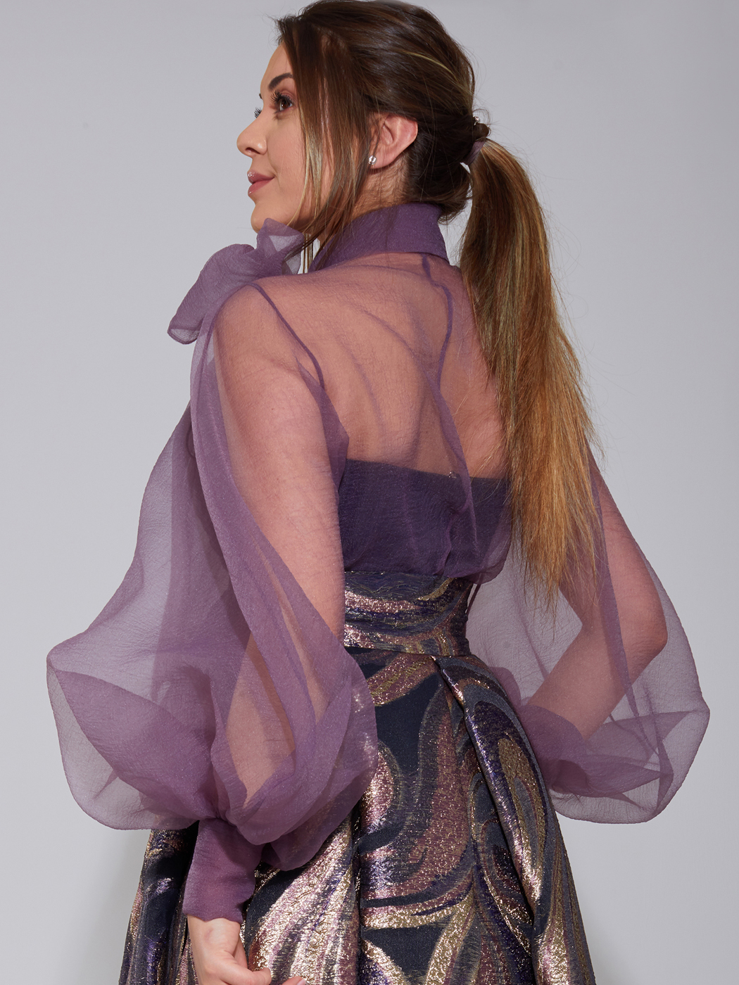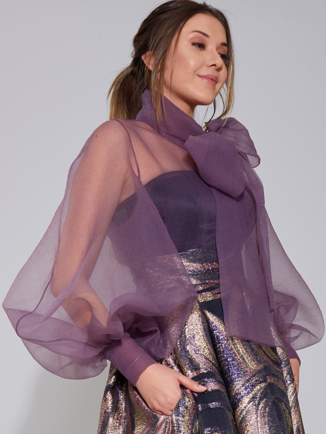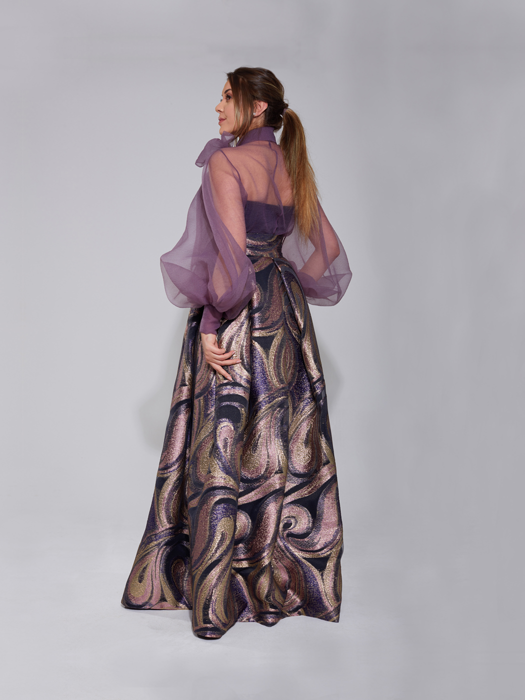 Kabarık kollu organze buluz ve cepli uzun brokar etek