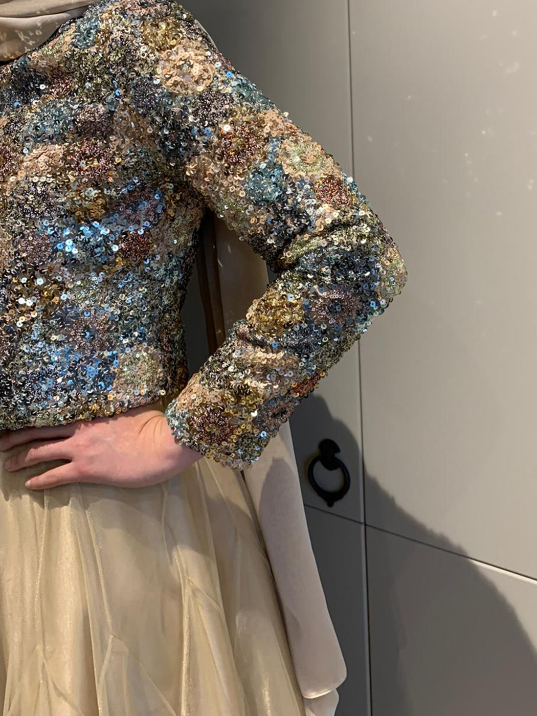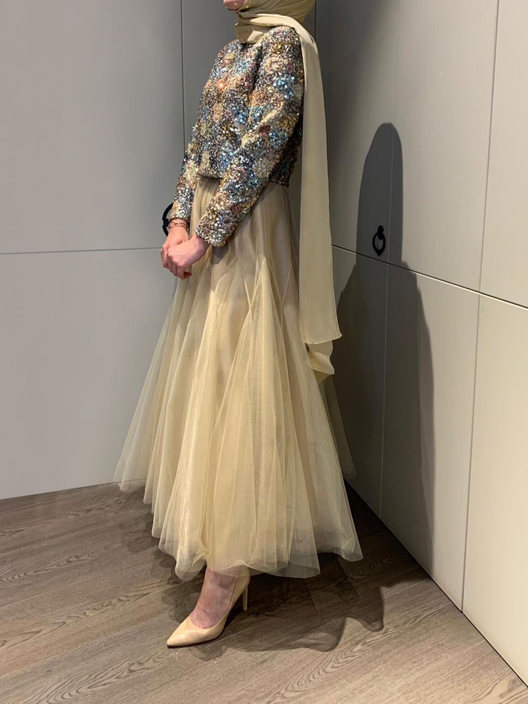 Arkadan metal fermuarlı buluz ve çok parçalı tül etek