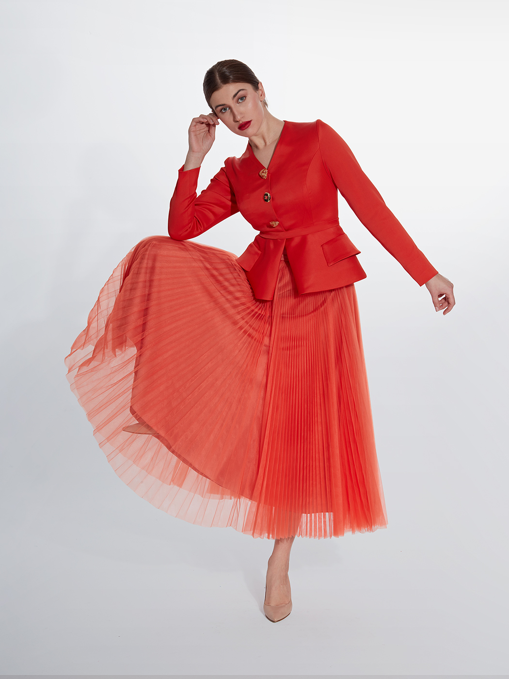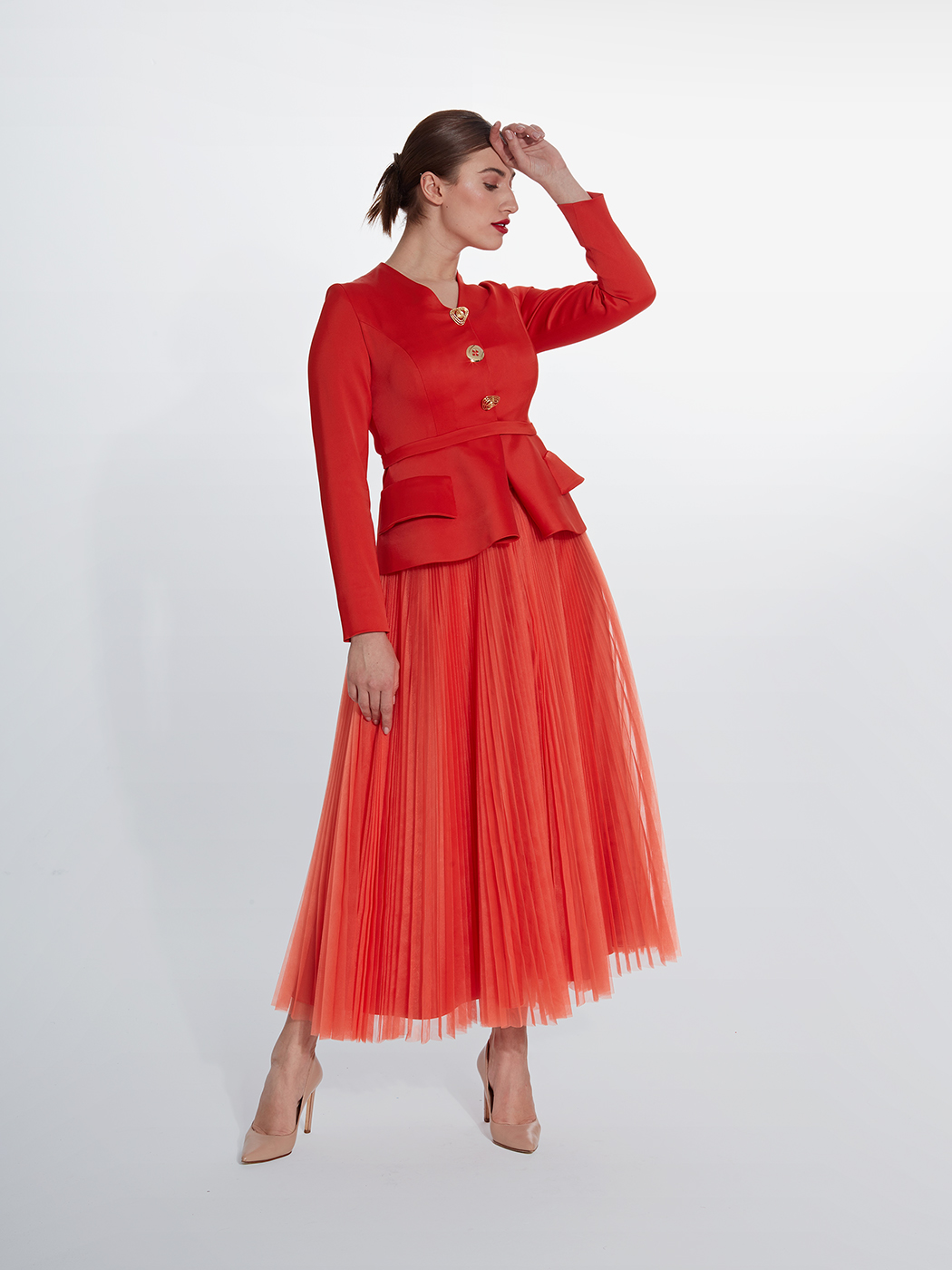 Cep kapaklı nar çiçeği ceket ve pilise tül etek