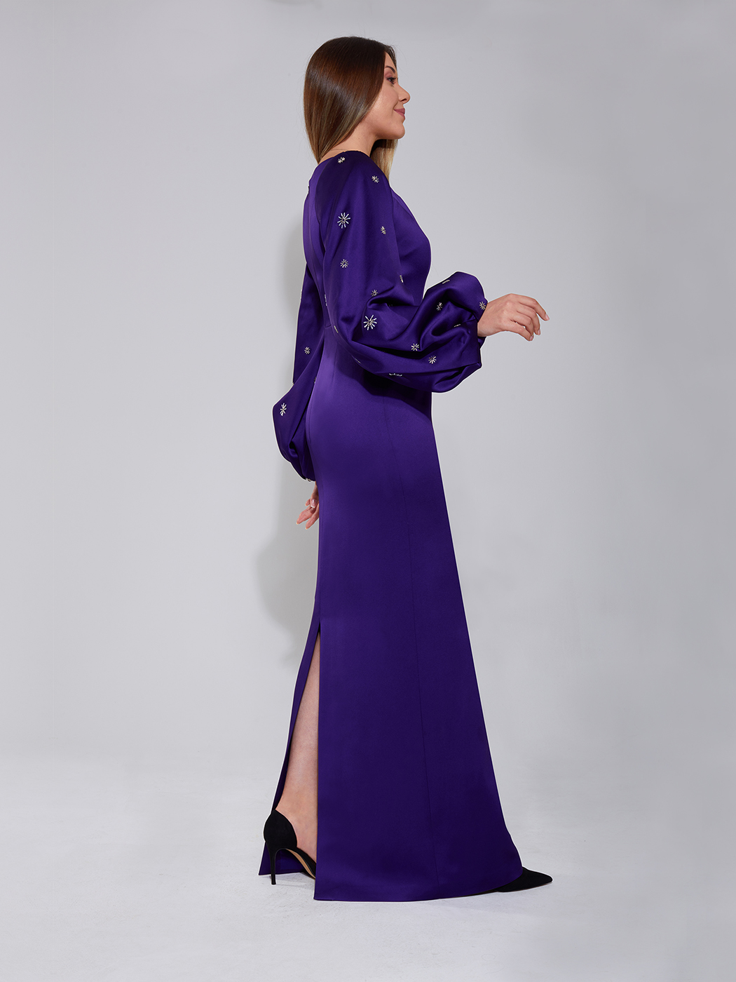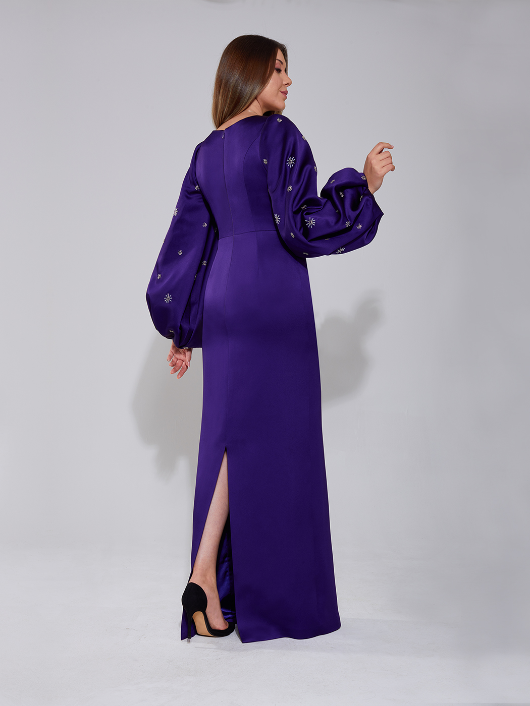 Kolları boncuk işlemili kabarık kollu elbise