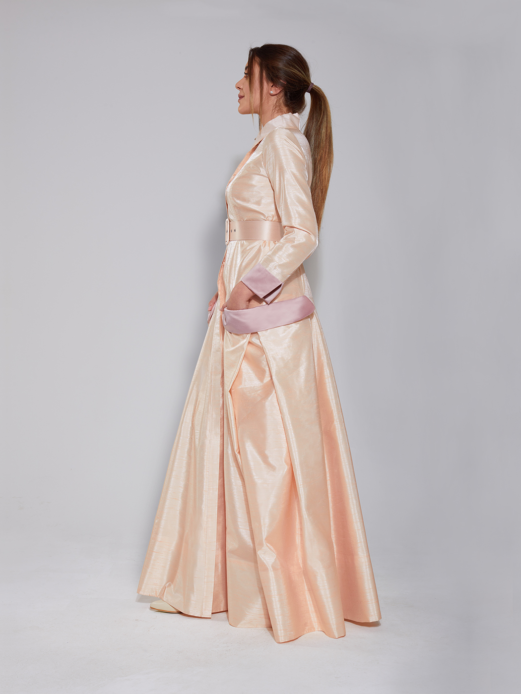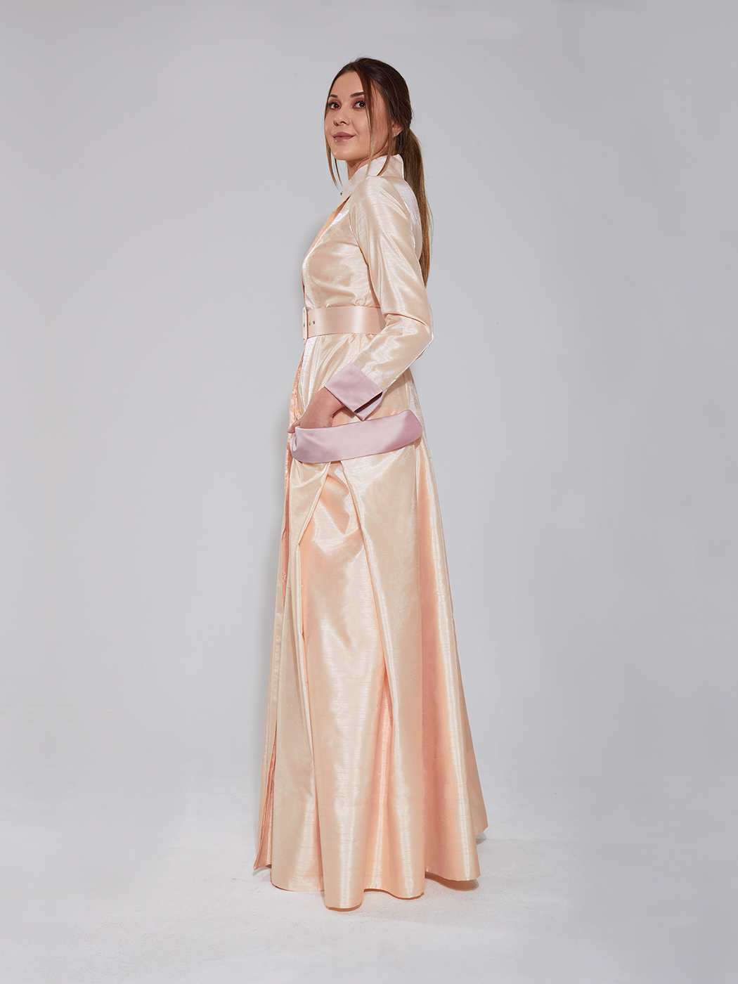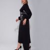 Belden kemerli, geniş torba cepli, boydan düğmeli gömlek elbise