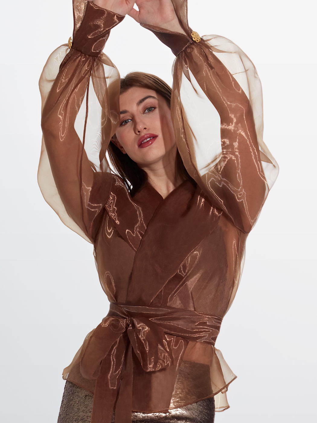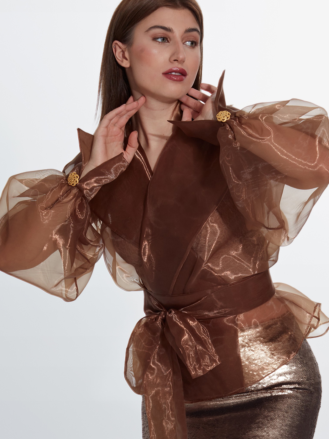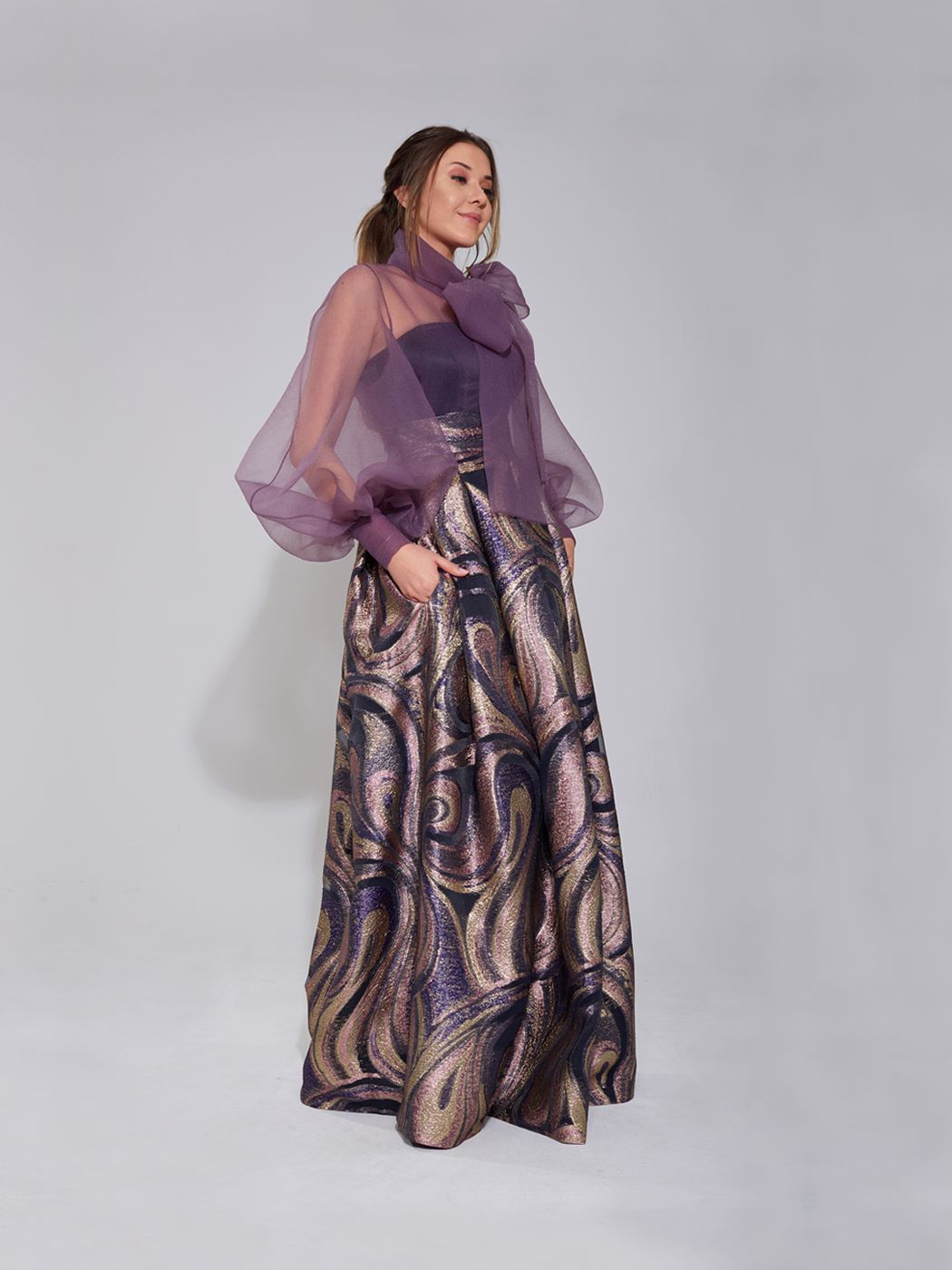 Organze gömlek ve uzun payet balık etek.