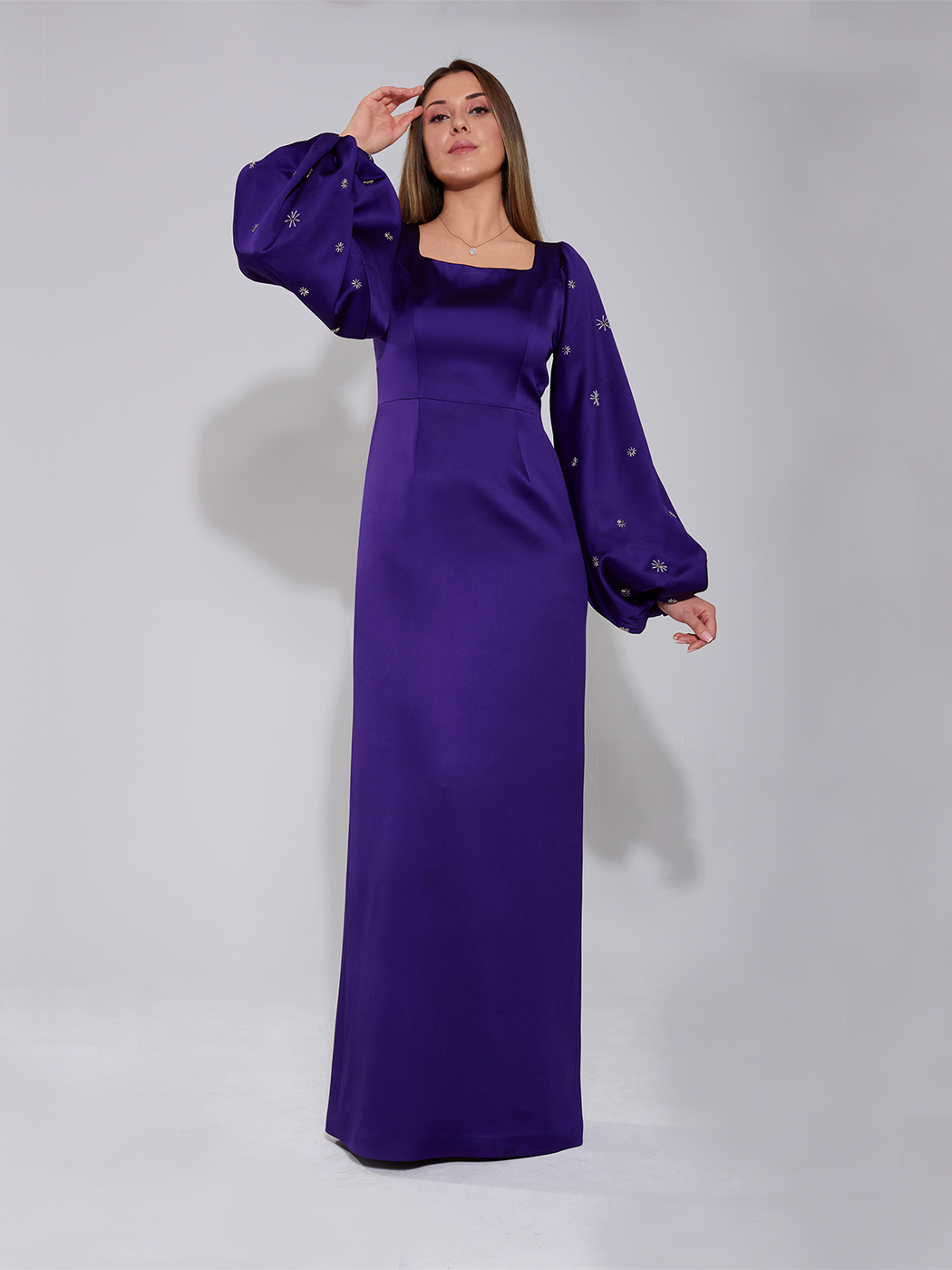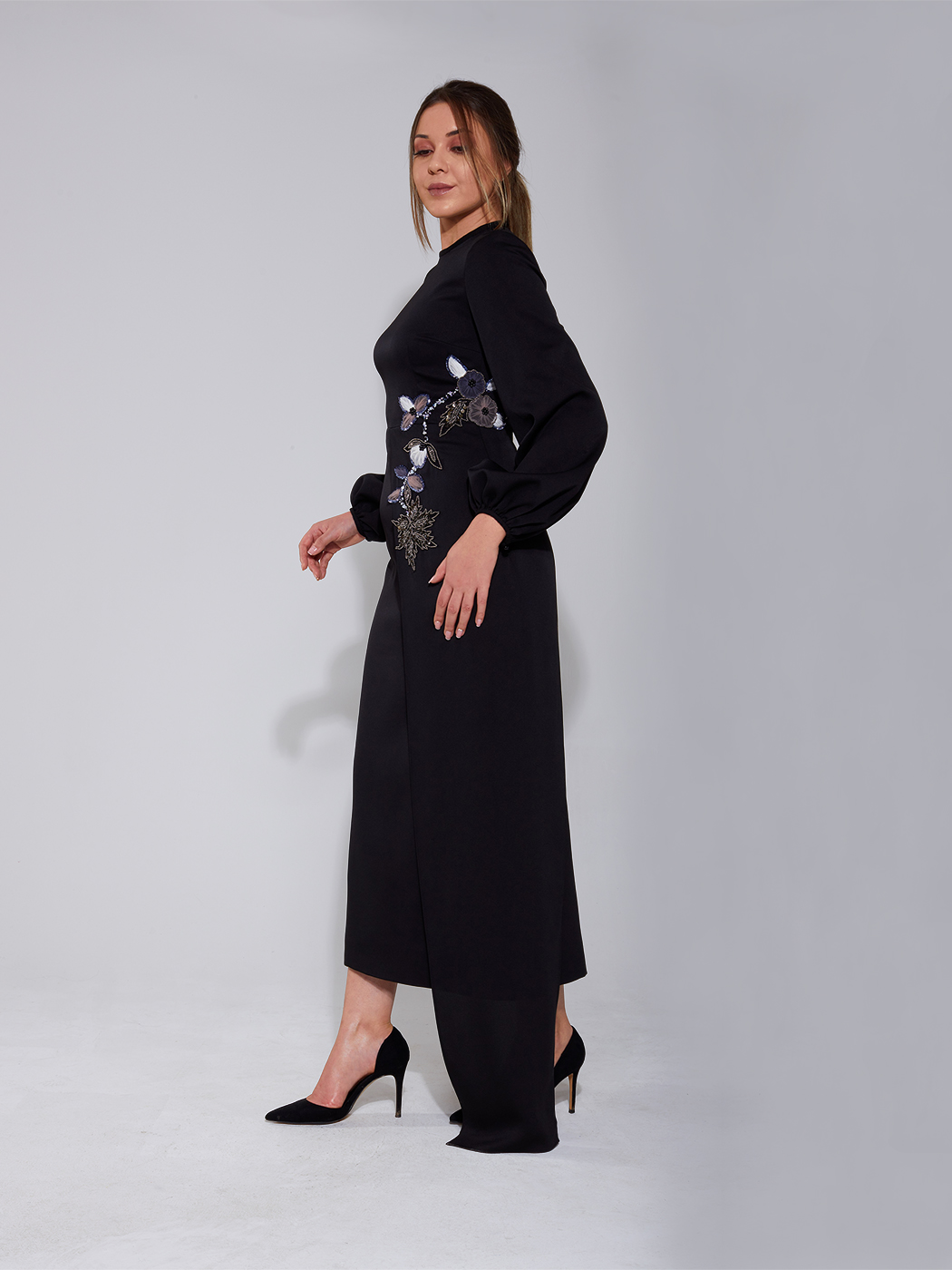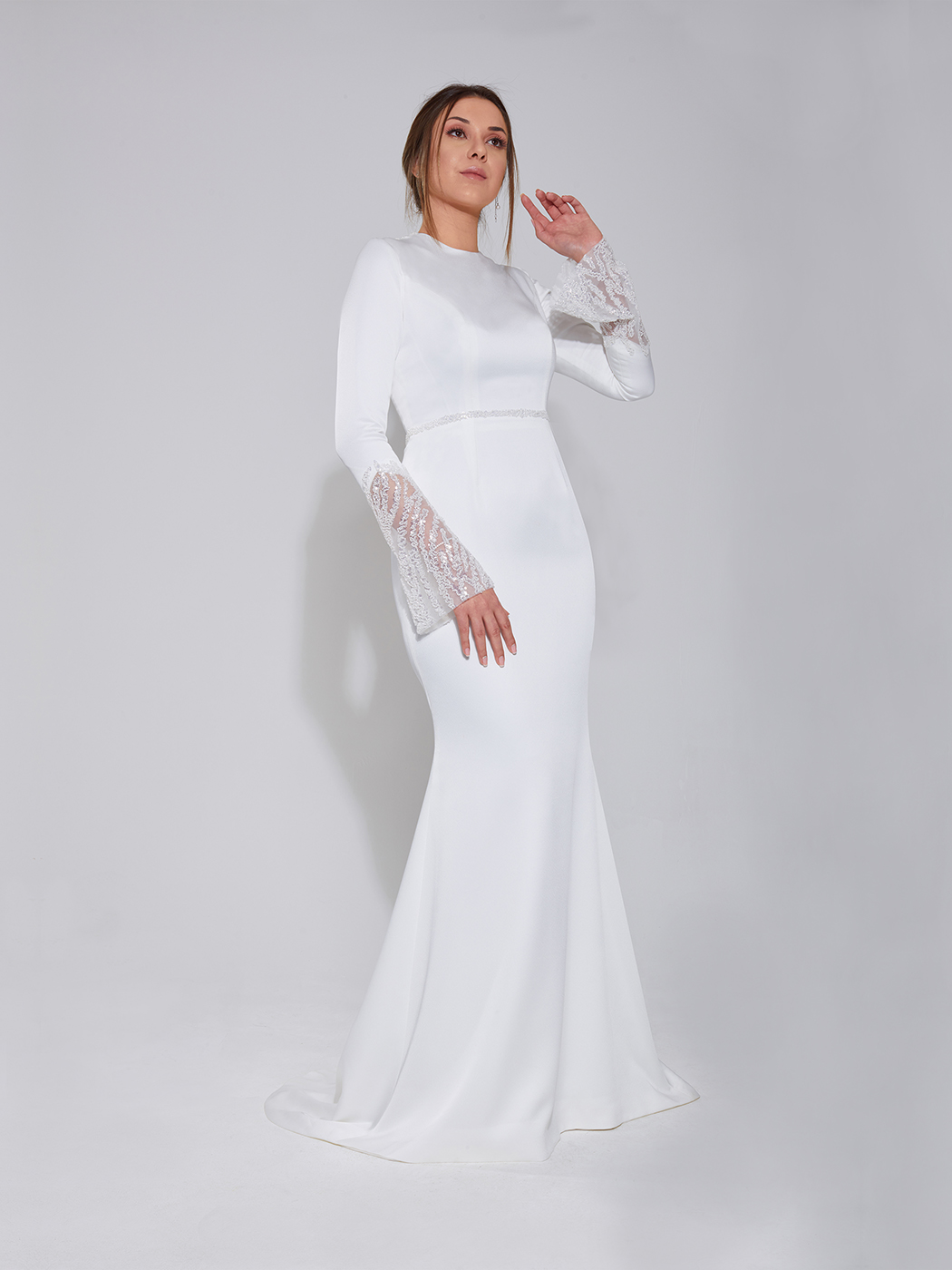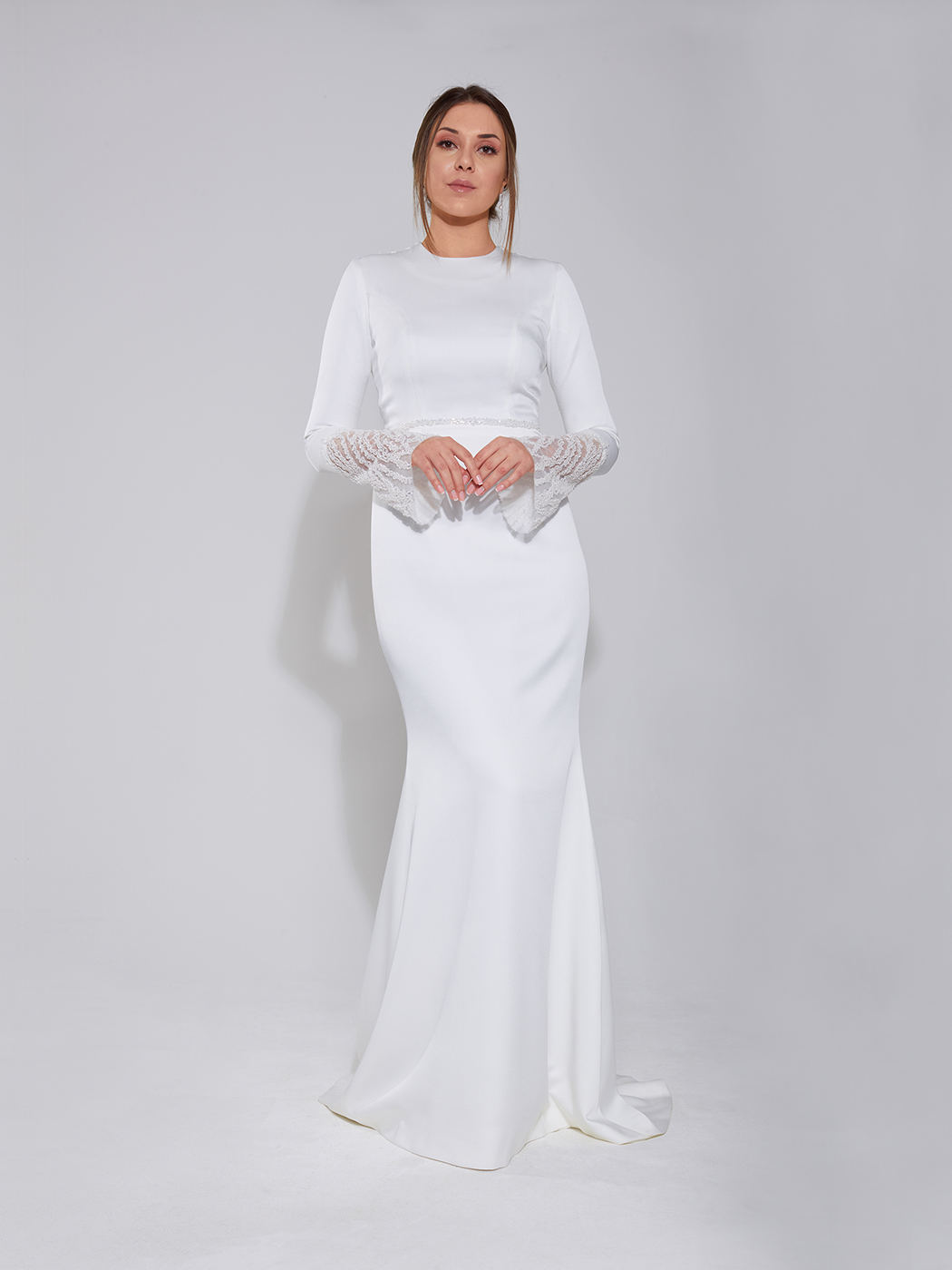 Sırt ve koldan dantel detaylı kuyruklu elbise